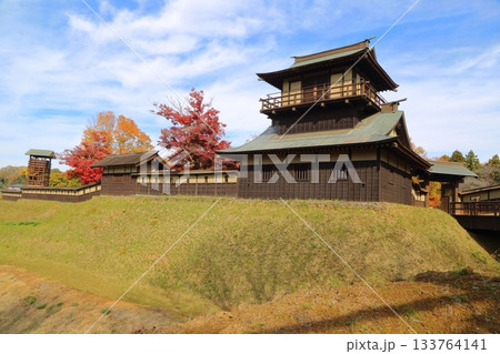 紅葉に包まれる逆井城の城壁と井楼矢倉