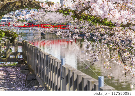春の小田原城址公園の風景、お堀に映る桜と学橋【神奈川県・小田原市】
