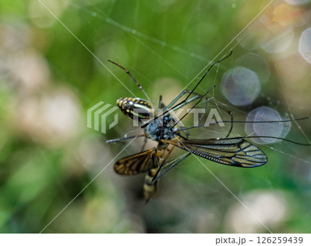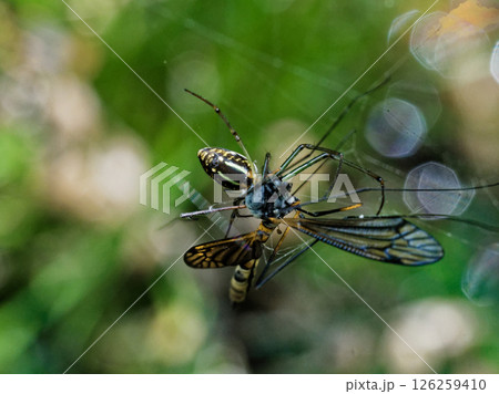 ガガンボを捕食するアシナガグモ科オオシロガネグモ
