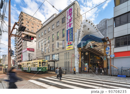 [九州・長崎] 船の船首の形をした浜んまちアーケードのゲートに停車中のトラム。