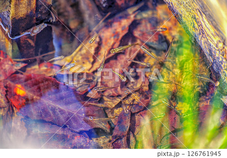 紅葉の水底と遊ぶメダカ