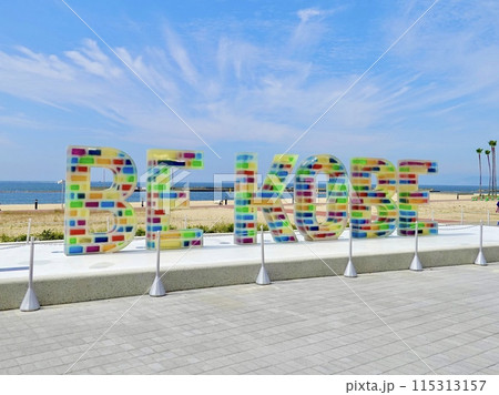 須磨海浜公園のBE KOBEモニュメント越しに砂浜と海が見える風景 兵庫県神戸市須磨区