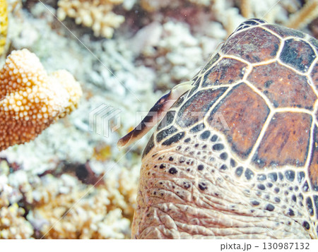 アオウミガメ。頭にウミウシを乗せていた。ダイバーもいる。美しいサンゴ礁と熱帯魚の群れ。 沖縄県島尻郡