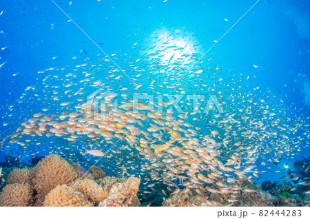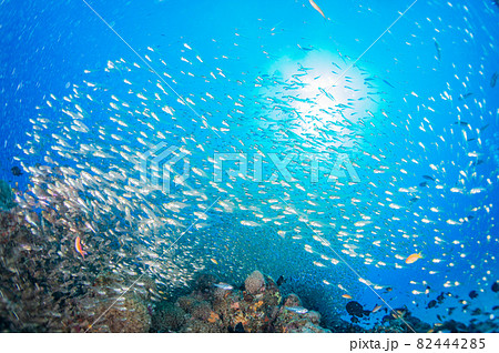 海中 魚 魚の群れ 小魚 すな 砂 家 複数 いっぱい たくさん 群れ 青 深海 海の底 泳ぐ 野生