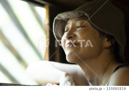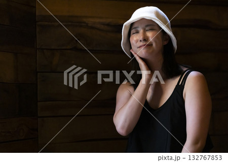 水を浴びて涼むカピバラの横顔|癒し・夏・リラックスのイメージ