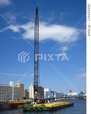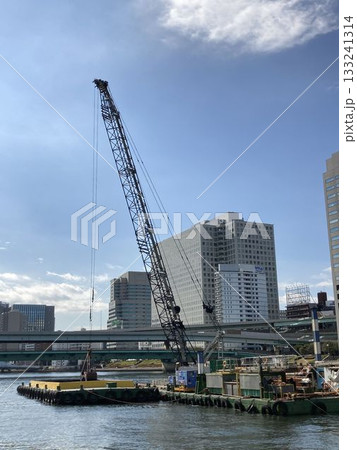隅田川で作業中のクレーン付台船