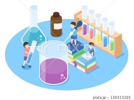 水溶液の実験をしている子供たちのアイソメトリックイラスト