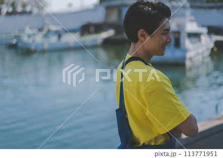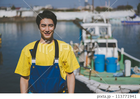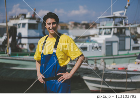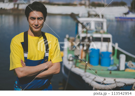 漁港に立つ若い漁業従事者