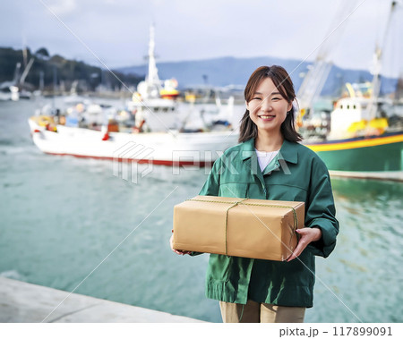 漁港からの産地直送の商品を抱える女性のイメージ素材