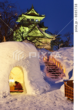 秋田県横手市のかまくら祭り 雪景色のかまくらと横手城