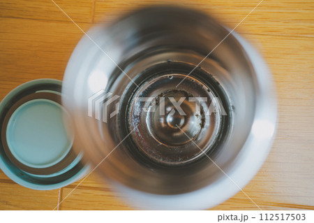車のドリンクホルダーにホットコーヒーを入れた水筒を置く