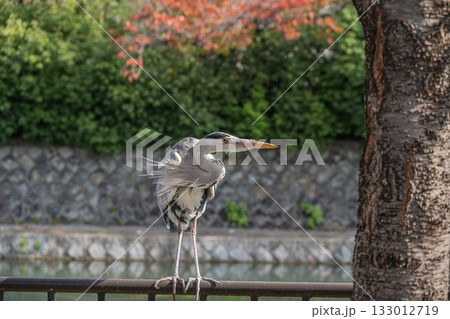 琵琶湖疏水沿いの柵の上に立つアオサギ 京都市