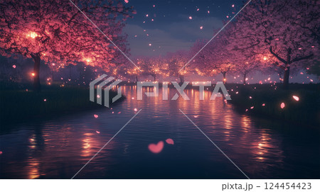 Cherry blossom tree reflection, peaceful canal with pink flowers, serene spring landscape, calm water, nature beauty, tranquil outdoor scene
