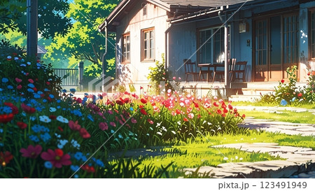 花が咲いた春の庭と、懐かしい雰囲気の家