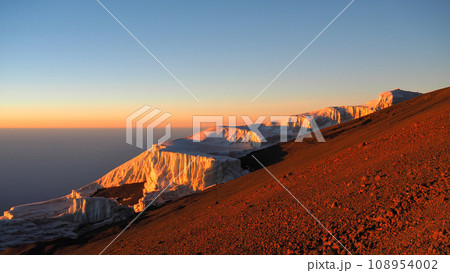 朝日に当たるキリマンジャロ山頂の氷河
