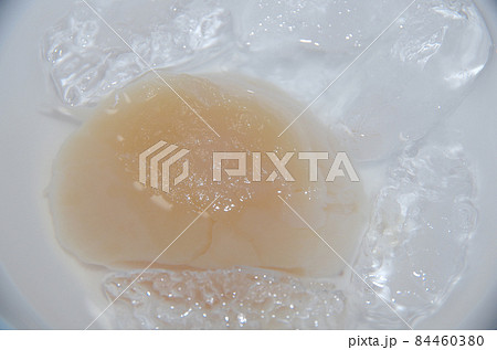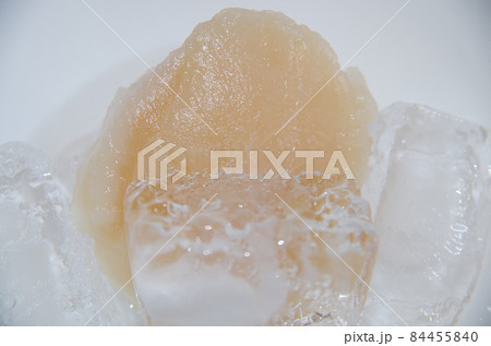 塩と氷を入れた器で冷凍の大きなホタテ貝柱(刺身用)を解凍している様子