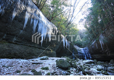 凍ってツララのできた美しい滝。愛媛県東温市にある白猪の滝の氷瀑。