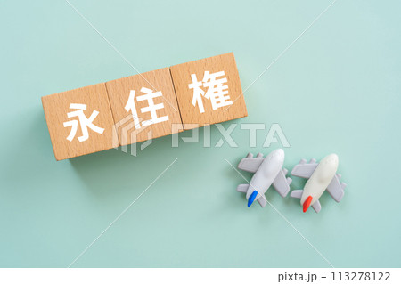 永住権の文字が入ったブロックとおもちゃの飛行機