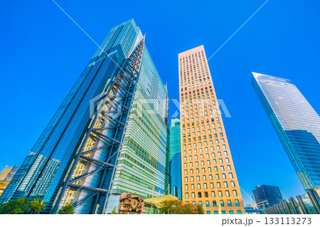 日本の東京都市景観 冬晴れの澄み切った青空が広がる汐留のオフィス群を望む