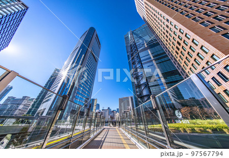 日本の東京都市景観 澄み切った青空が広がる汐留のオフィス群を望む