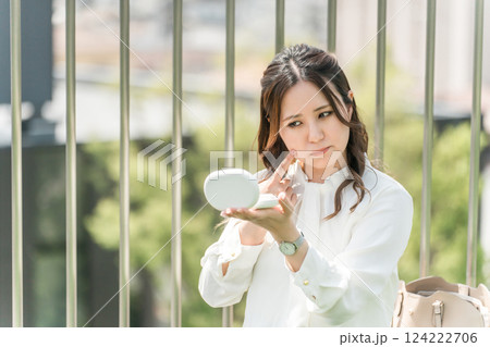 化粧直し・メイク直しをする女性(ファンデーション,肌荒れ,ニキビ,吹き出物,ハリ,乾燥)