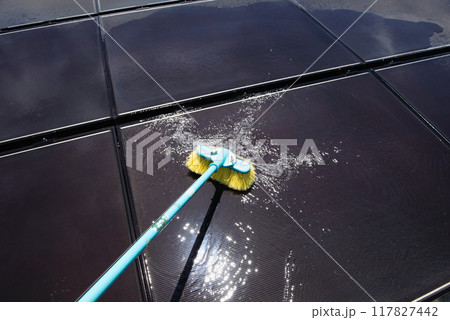 陸屋根の汚れた太陽光発電パネルの通水デッキブラシでの清掃