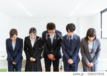 不祥事で謝罪する会社・企業に勤める5人のスーツ姿のビジネスマン(汚職・偽装・違反・事件・不正)