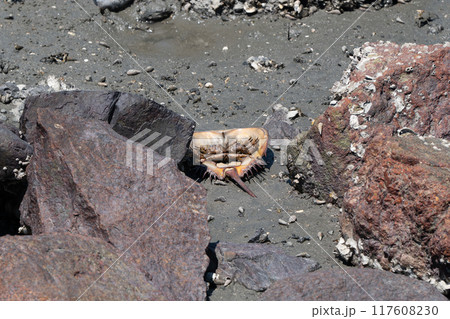 細長いくちばしで何かをくわえたイソシギ(地球33番地近くの江ノ口川のわんど)