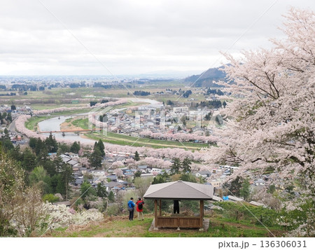 角館・古城山公園 展望台から望む武家屋敷通りと桜満開の春景色(秋田県仙北市)
