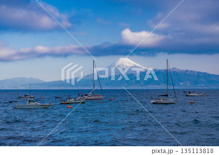 【静岡県】駿河湾に浮かぶヨットと富士山 早朝