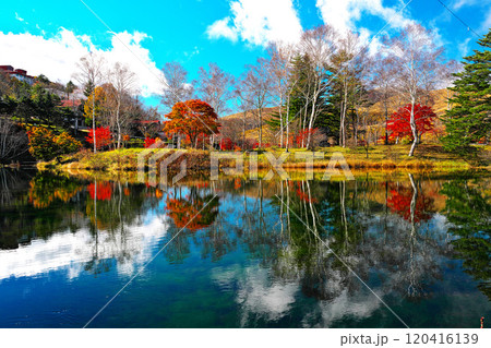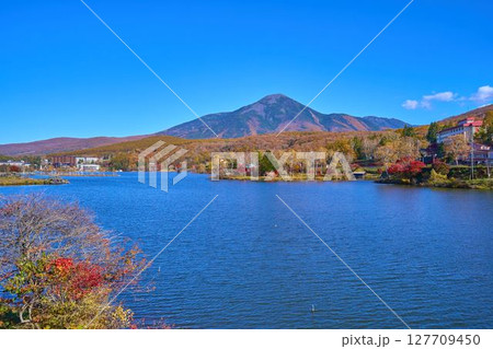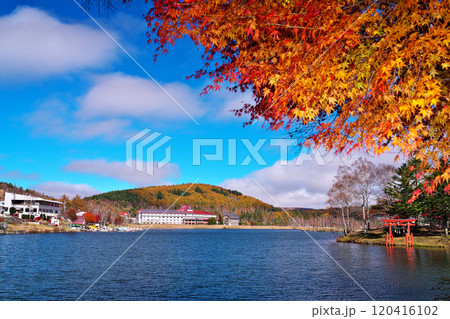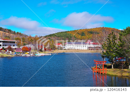 秋の長野県の白樺湖西側湖畔から東側の風景(蓼科山,池の平神社鳥居など)