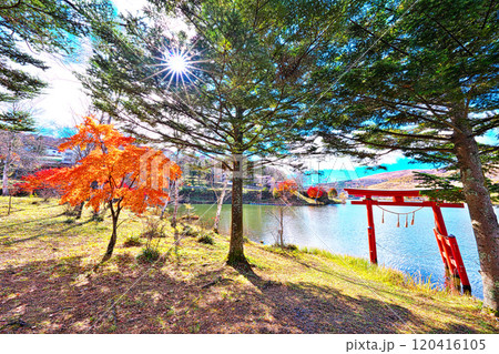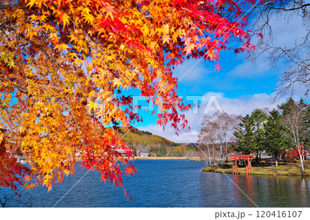 白樺湖にある池の平神社と紅葉 長野県
