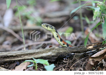 日本固有種で日本全国の標高の低い山地や水辺、水田地帯、湿地帯などを好み生息している毒蛇のヤマカガシ