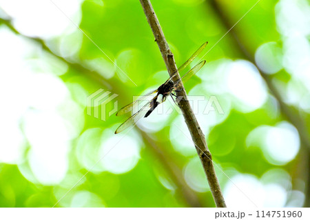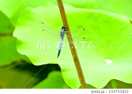 池の枯れ枝にとまる シオカラトンボ オス