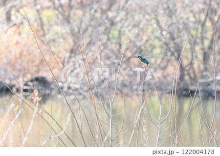 池の畔の枯れ枝にとまるカワセミ