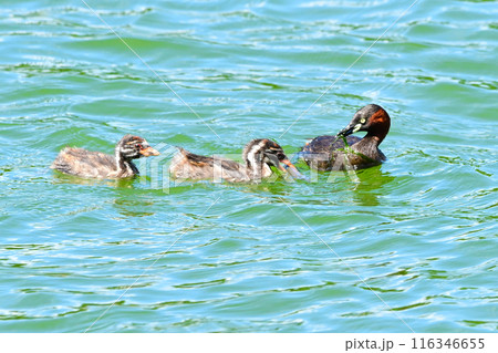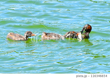 幼鳥にエサをあげる親鳥 カイツブリの子育て風景