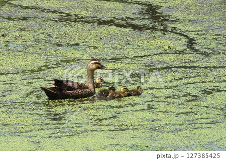 子供たちと一緒に食事しているカルガモ(A spot billed duck )