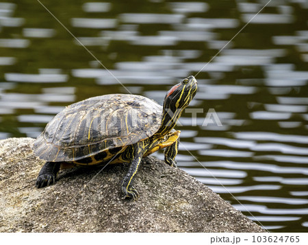 池の岩の上で甲羅干しするミシシッピアカミミガメ