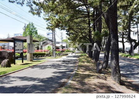 愛知県 知立の松並木と側道と観光案内板と東屋