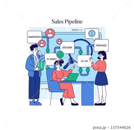 Vector illustration of a business team planning a sales pipeline. Individuals collaborate with laptops and notes to define phases like awareness, interest, decision, and purchase.