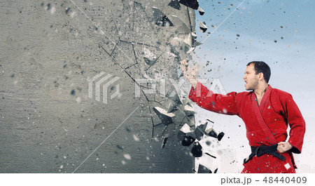 A dynamic character breaking through an impressive wall made entirely of colorful and sparkling crystals