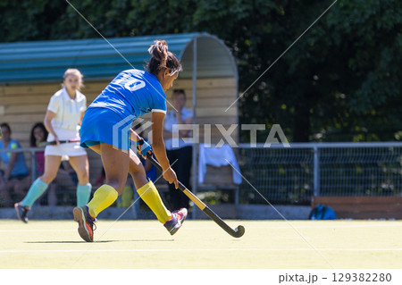 Competitive field hockey match featuring players in action at a sunny outdoor venue