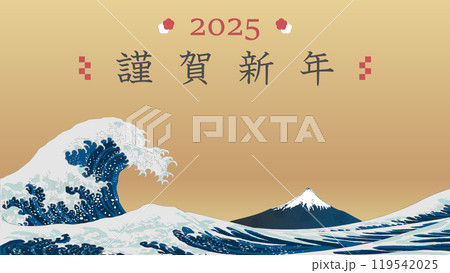 北斎の浮世絵風の2025年、Happy new yearの背景イラストバナー素材 ベクター 16:9