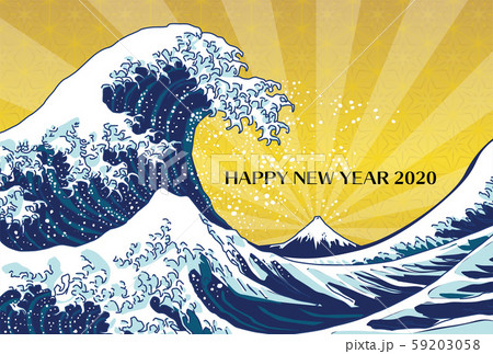 北斎・富嶽三十六景・神奈川沖浪裏/年賀状素材・a happy new yearー日の出サンライズ