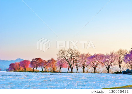 早春残雪の新潟県十日町市津南町沖ノ原台地雪上桜風景