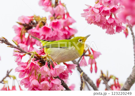 沖縄県名護市名護城公園さくらの園 南西諸島に生息するリュウキュウメジロと日本一早咲きの琉球寒緋桜