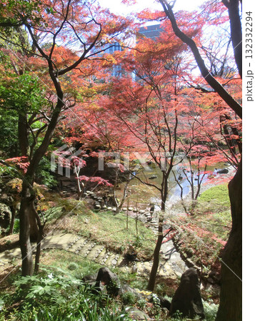 紅葉が美しい秋の小石川後楽園(清水観音堂跡から見た大堰川)