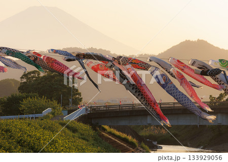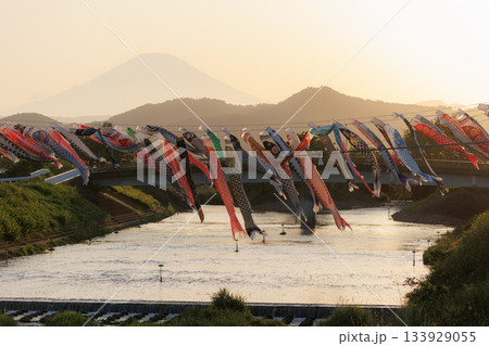 鈴川こいのぼりと夕焼けと富士山(神奈川県平塚市)