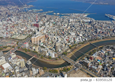 鹿児島市の甲突川河口付近の上空から