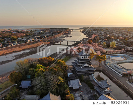 大分県中津川河口沿いに建つ夜明けの中津城の空撮